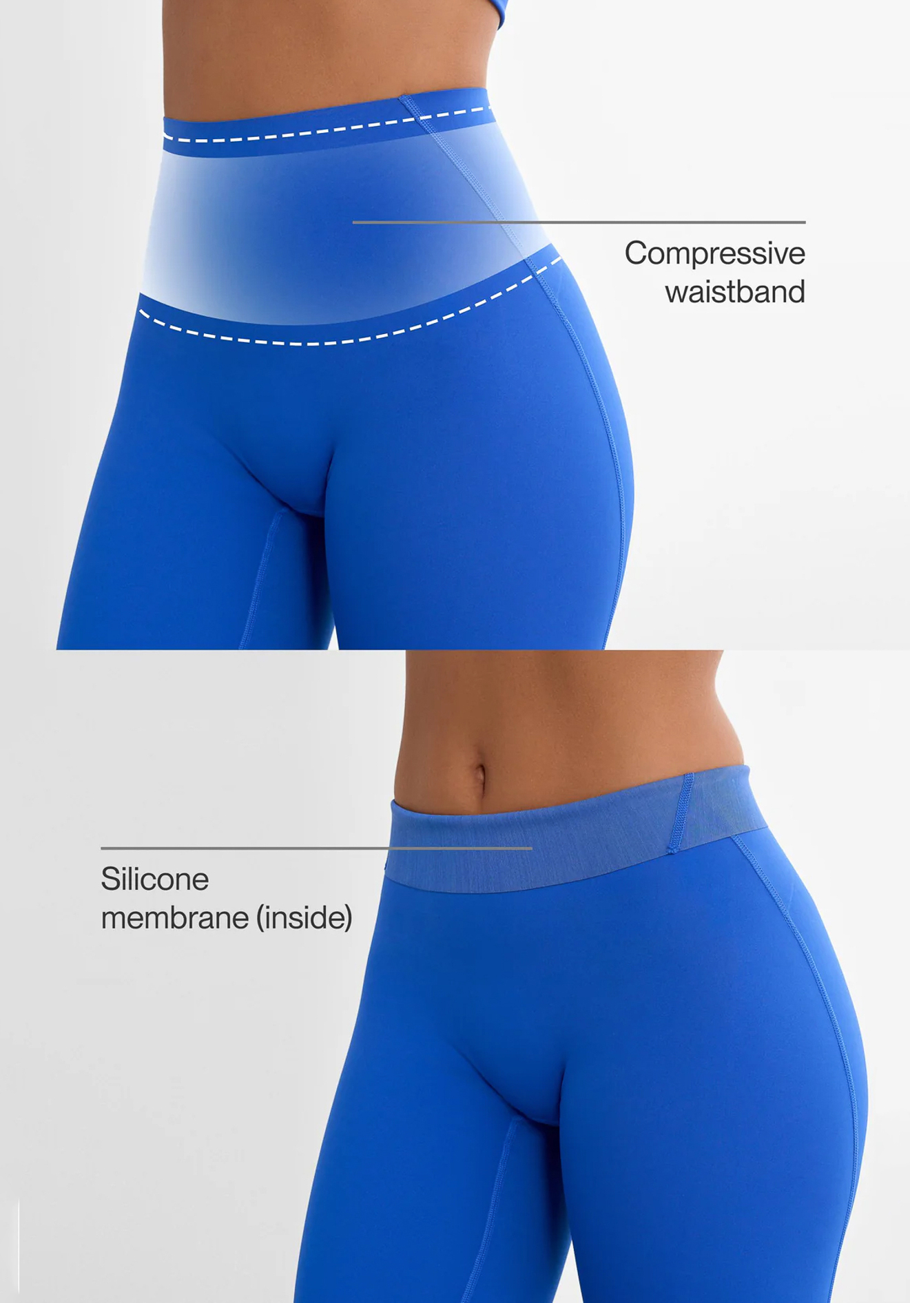 Joustava materiaali siirtää kosteutta pois iholta ja antaa sekä pakaroille että vatsalle imartelevan istuvuuden. Kangas on laserleikattu minimaalisen kitkan saavuttamiseksi, ja vyötärön sisäpuolella on huomaamaton silikoninauha ilman saumoja.